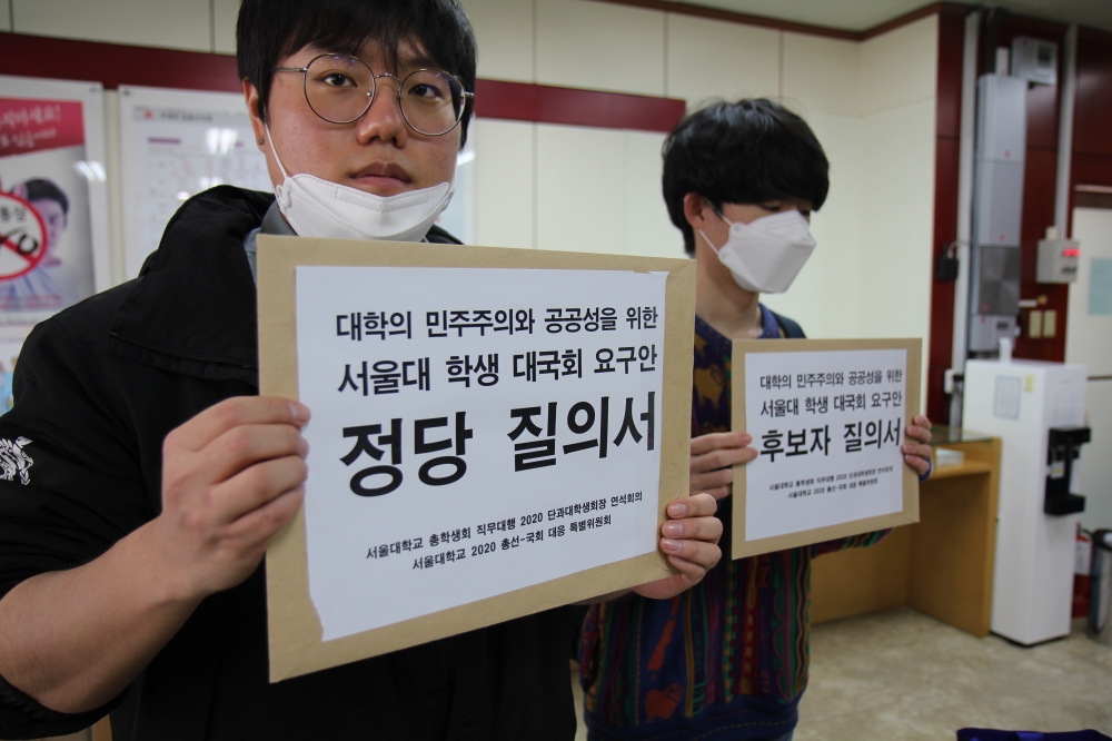 오늘(23일) 오후 12시 서울대학교 학생들이 행정관(60동) 앞에서 기자회견을 열고 대국회 요구안을 발표했다. ‘서울대학교 2020 총선·국회 대응 특별위원회(총선특위)’ 홍류서연(사회 17) 위원장은 “유보되는 대학 민주주의와 훼손되는 교육 공공성에 국회가 응답해야 한다”고 힘줘 말했다. 총선특위는 ▲평의원회 학생참여 ▲교원징계위원회 제도개선 ▲국가책임 고등교육 재정지원을 국회에 요구했다.