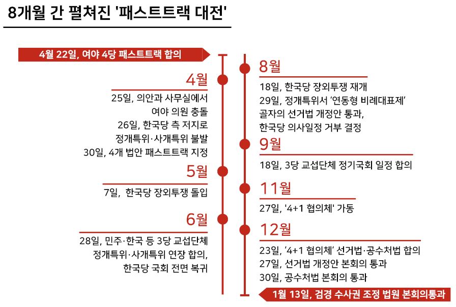 ▲공직선거법 일부개정법률안(선거법 개정안) ▲고위공직자범죄수사처 설치 및 운영에 관한 법률(공수처법) ▲검찰청법 일부개정법률안과 형사소송법 일부개정법률안(검경 수사권 조정 법안)을 둘러싸고 벌어진 2019년 패스트트랙 정국은 거대 양당의 막무가내식 대립으로 소통과 협치가 실종된 20대 국회의 모습을 대표한다. ‘박근혜-최순실 게이트’와 같은 권력형 비리가 조기에 차단되지 못한 이유로 검찰의 부패와 중립성 상실이 꼽히면서 ‘검찰개혁’의 일환으로 공수처법과 검경 수사권 조정안이 공론화됐다. <MBC>는 2017년 12월 공수처 설치 찬성 여론이 81.1%라 발표했고 19대 대선 주요 후보자 5명 중 한국당 홍준표 후보를 제외한 4명도 검찰개혁을 공약했다. 검찰개혁안과 함께 패스트트랙에 오른 ‘준연동형 비례대표제’를 골자로 한 선거법 개정안은 국회의원 선거의 고질적인 문제점인 정당 대표성과 비례성의 부족을 해소하기 위한 시도였다.