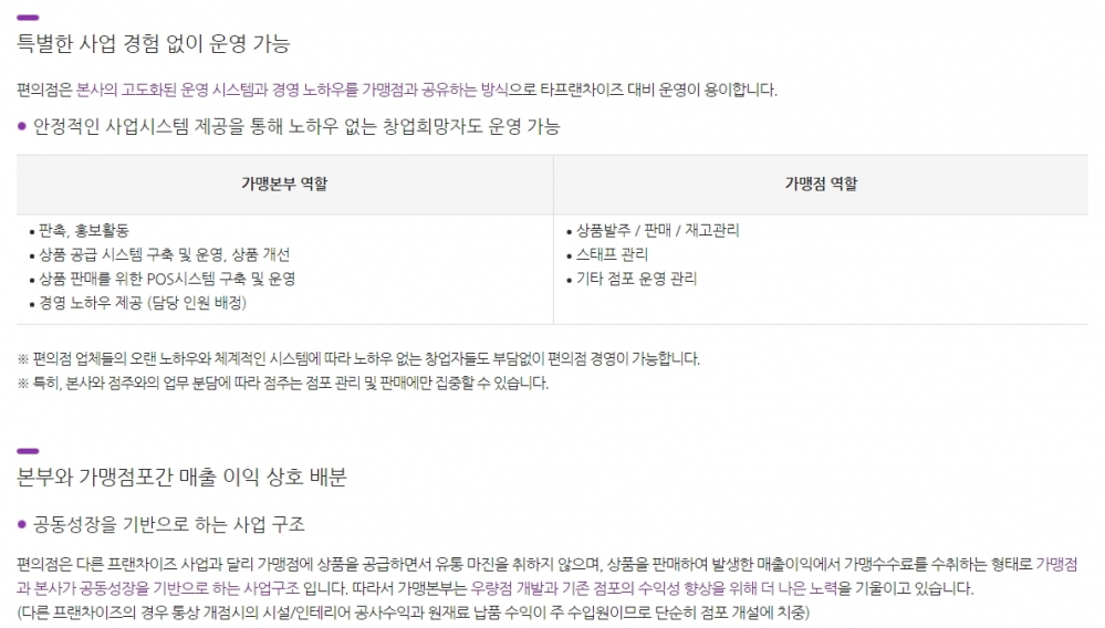 시장의 포화에도 불구하고, 편의점 프랜차이즈 가맹본부(가맹본부)들은 여전히 공격적으로 외연을 확장한다. 국내 최대 가맹본부 중 하나인 C사는 창업 설명회를 지역별로 주 2회 이상 열고 있다. 다른 가맹본부인 G사는 서울 지역 가맹점 창업 설명회를 주중 매일 개최한다. 가맹본부들은 점주와의 상생을 내세우며 창업을 유도한다. C사의 창업 안내문은 ‘가맹본부와 점주 간 업무 분담에 따라 점주는 점포 관리 및 판매에만 집중할 수 있다’고 강조하며 ‘안정적인 사업시스템 제공을 통해 노하우 없는 창업 희망자도 운영 가능하다’는 낮은 진입 장벽을 내세운다. 특히 C사는 개점 후 2년간 점포 운영에 필요한 최소한의 비용 보전을 약속하기도 한다.