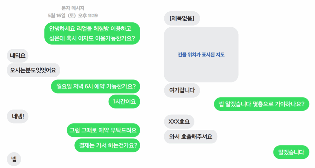 리얼돌 체험방은 유사성매매 업소의 일종인 ‘오피방’과 비슷하게 운영된다. 체험방을 예약하면 리얼돌이 있는 오피스텔 방 호수를 알려주는 식이다. 이런 운영방식은 체험방이 역세권이나 대로변에도 버젓이 자리할 수 있게 만든다. 겉으로 보기에 체험방은 평범한 오피스텔과 다를 바 없기 때문이다. 체험방이 번화가에 위치할수록 이용자의 ‘죄책감’은 줄어든다. 한 이용자는 체험방 업체 사이트 게시판에서 ‘(체험방이) 대로변에 있다면 ‘일반인 코스프레’가 가능할뿐더러 사람이 많으니 (남들의) 시선에서 금방 벗어날 수 있다’며 만족해했다.