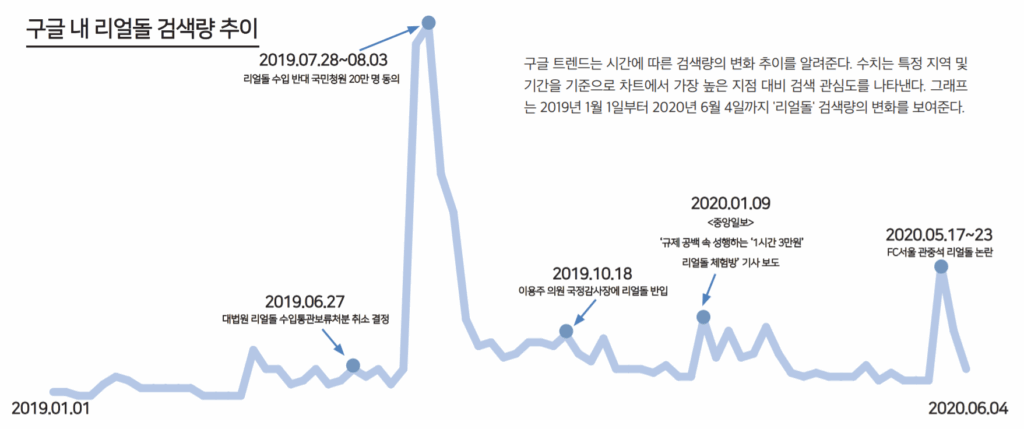 사라진 줄 알았던 인형체험방이 ‘리얼돌 체험방’이라는 이름으로 다시 등장했다. 지난해 대법원의 리얼돌 수입 허가 결정이 그 원인일까. 대법원 판결 직후 리얼돌 수입에 반대하는 청와대 국민청원이 26만 명 이상의 동의를 얻으며 언론에 크게 알려졌다. 실제로 언론이 리얼돌로 시끄러웠던 지난해 7월 리얼돌에 대한 구글 검색량이 대폭 증가했다. 법망을 피해가며 수입돼 ‘아는 사람만 알던’ 리얼돌이 세상에 알려진 것이다.