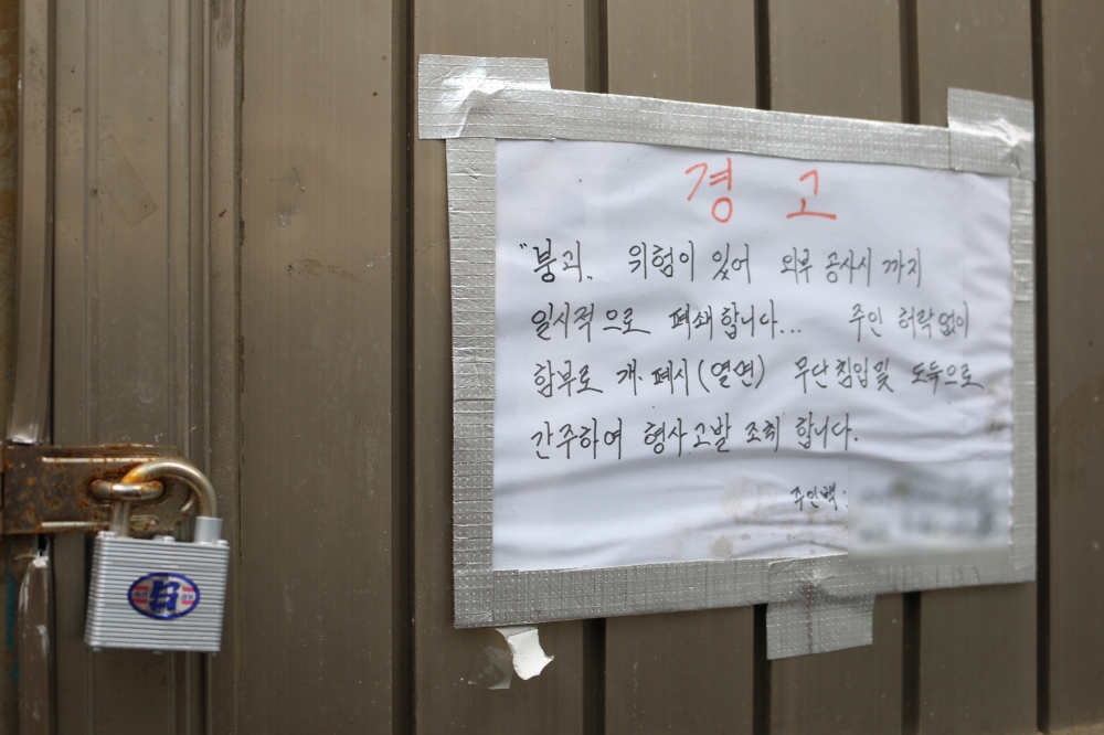 원래 재개발로 퇴거당하는 주민들은 법의 보호를 받게 돼 있다. 도시정비법 제61조에 따르면 사업시행자는 재개발로 철거되는 주택의 세입자에게 임대주택이나 주거이전비, 이사비를 제공하는 등 임시주거와 유사한 조치를 해야 한다. 이 말은 거꾸로 세입자가 없으면 사업시행자의 의무도 없다는 뜻이 된다. 건물주들은 이런 허점을 이용해 재개발 이전에 건물을 폐쇄하고 주민들을 내쫓는다. 이들은 건물의 노후화나 리모델링 등 각양각색의 폐쇄 이유를 대지만 정작 재개발이 진짜 이유라고는 말하지 않는다.