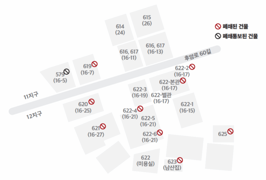 다른 건물들 역시 16-7처럼 건물이 노후화됐다며 폐쇄되거나, 리모델링 등의 이유로 철거 수순을 밟았다. 외벽에 금이 갔다며 주민들을 퇴거시킨 건물도 있었다. 12지구의 건물 13채 중 8채, 11지구의 건물 6채 중 1채가 그렇게 문을 닫았다. 11지구의 16-5(구 579번지) 주민들은 올해 6·7월 말까지 퇴거하라는 통보를 받았으나, 아직 쪽방이 문을 닫진 않았다. 1층의 가게 주인은 9월 말로 퇴거가 미뤄졌다고 전했다.