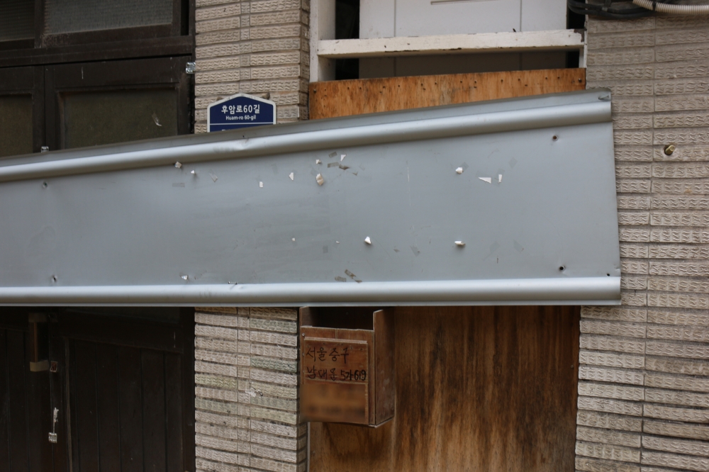 김송태 씨는 벌써 두 번이나 길거리 사랑방에서 노래를 불렀다. 길거리 사랑방에서는 ‘노래 하나 사연 둘’ 코너를 진행한다. 주민 한두 명이 나와 그간 어떻게 살아왔는지를 이야기하고 그에 맞는 노래를 부르는 시간이다. 김 씨는 바깥에서 술을 마시다가 활동가들에게 불려 나와 노래했다며 몇 번이고 말했다. 수요일마다 천막이 서는 바로 그 자리에서 김 씨를 마주쳤을 때도 그는 술을 따라 마시고 있었다. “리모델링한다고 두세 달 치 방세 안 받고 내쫓았다고. 나도 억울해서 술 먹고 앉아 있잖아.” 김 씨가 살다가 내쫓긴 건물은 16-25(구 620번지), 그가 앉아있던 자리를 입구로 했던 곳이다. 지금은 자물쇠로 문이 굳게 잠겨있다.