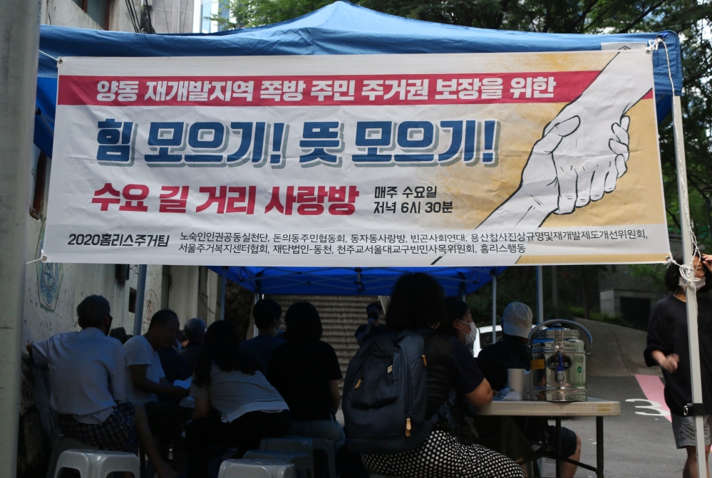 이동현 활동가는 주민들에게 재개발사업 진행 상황을 설명한 뒤에야 길거리 사랑방 행사의 성격을 밝혔다. “우리가 어떻게 살아야 할까, 개발 이후에 우리 주민에 대한 주거대책을 어떻게 세우라고 하는 게 좋을까, 이런 주제로 이야기를 하는 자리입니다.” 길거리 사랑방의 진짜 이름은 ‘양동 재개발지역 쪽방 주민 주거권 보장을 위한 힘 모으기 뜻 모으기 수요 길거리 사랑방’이다. 주민들에게 재개발 사실을 알리고, 함께 힘을 합쳐 재개발에 대응하기 위해 ‘2020홈리스주거팀’이 나서서 기획한 주민 자치 행사다.