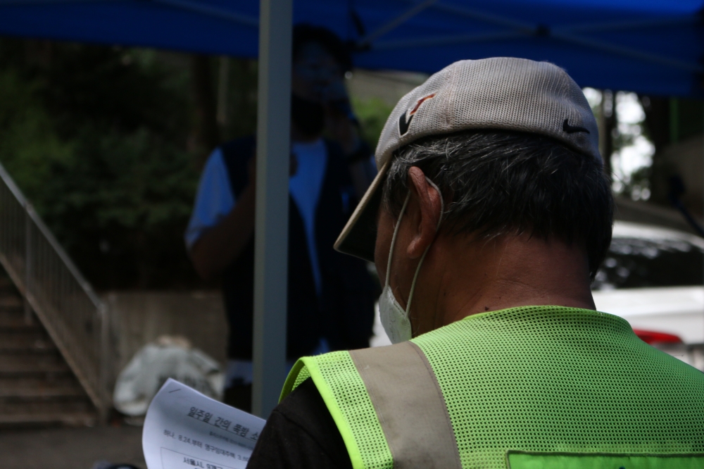 “어르신, 체온 재셔야 해요.” 코로나19 방역 명부 작성을 돕는 활동가의 손길이 바빴다. 이름 왼편에 주소를 적는 칸은 그다지 쓸모가 없었다. 기자를 제외하곤 모두 ‘남대문로5가동’을 썼다. 활동가는 주민들에게 동 이름 대신 쪽방 ‘몇 동 몇 호’에 사는지를 물었다. 다른 활동가는 천막 아래 군데군데 비어 있는 자리를 채우기 위해 근처 벤치와 천막 사이를 분주히 오갔다.