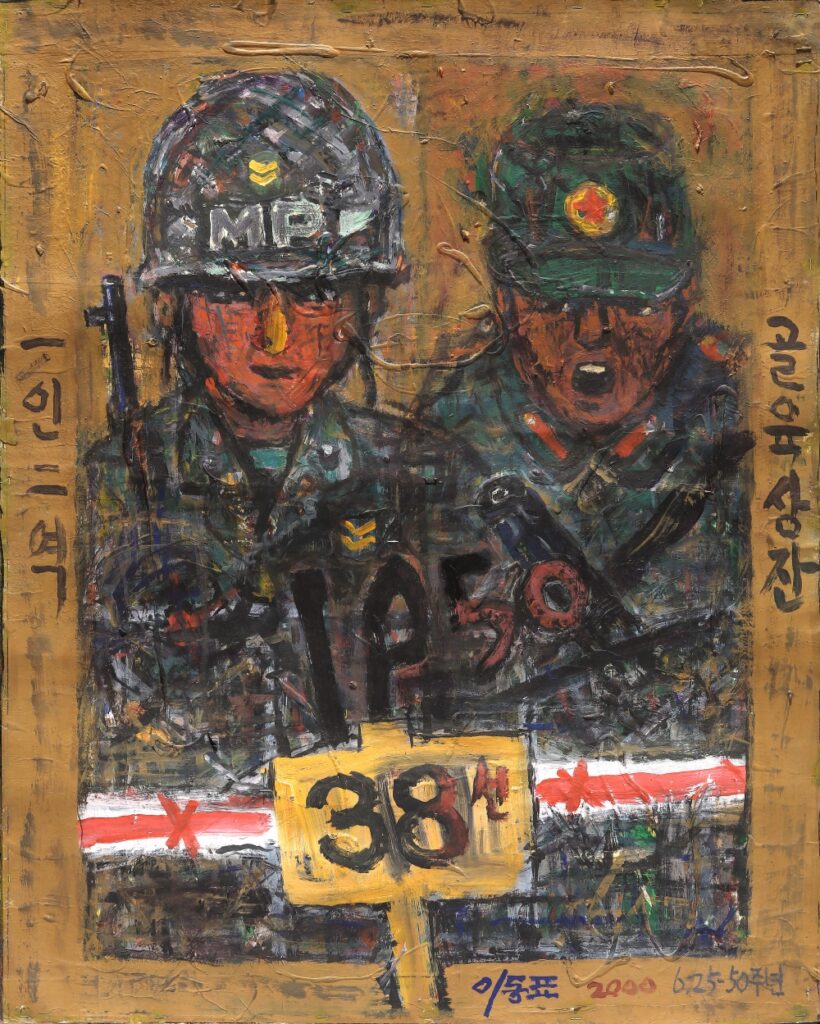 마찬가지로 전쟁터에서 죽거나 다른 사람을 죽일 수 있는 군인은 영웅이 아니다. 이념과 정치가 만들어낸 부조리의 희생자다. 이동표의 「일인이역 골육상잔」에서 그린 군인도 영웅과는 거리가 멀다. 작가는 작품을 설명하면서 “골육상잔은 뼈와 살이 서로 싸우는 것”이라고 말했다. 그림엔 서로 다른 군복을 입은 남북한 군인이 나란히 서 있는데, 두 군인 모두 작가 본인의 얼굴을 하고 있다. 작가는 분단 이전 북한에서 태어나 인민군으로 징집됐고, 이후 월남해 국군에 입대하며 ‘일인이역’을 수행했다. 작가에게 동족을 죽여야만 했던 한국 전쟁은 더없이 모순된 기억이었을 것이다. 그런 전쟁을 치러야만 하는 상황에 내몰린 군인들은 영웅보다는 희생양에 가깝지 않을까.