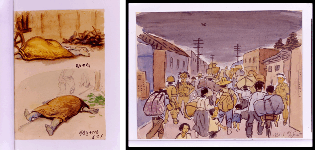 전시의 1부는 한국 전쟁의 기억을 되살리기 위한 과정이다. 예술은 전쟁과 절대 가까워질 수 없을 것 같지만, 언어로 전해지지 않는 전쟁의 기억을 예술이 전해줄 수 있다. 화가 김환기는 종군화가로 활동하며 전쟁을 그렸고, 김성환은 인민군 점령 하의 서울에서 숨어지내면서 작품 활동을 이어갔다. 그중 김성환의 「6·25 스케치」 연작은 전쟁이 벌어지고 있는 서울의 모습을 보여준다. 그림속 종로4가 한복판엔 시체가 버려져 있다. 전시 장소인 현대미술관에서 차로 불과 10분이면 닿는 곳이다. 오늘날 출퇴근하는 시민들과 관광객으로 붐비는 서울의 거리는 봇짐을 머리에 인 피난민들로 가득 차 있다. 우리의 일상공간에서 벌어졌던 전쟁의 모습을 화가의 눈으로 바라보면서, 전쟁이란 낯선 집단기억은 각자의 머릿속에서 되살아난다.