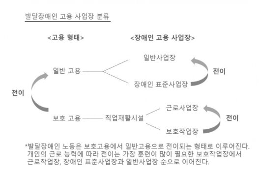 발달장애인 고용 사업장은 크게 일반사업장과 장애인 표준사업장, 직업재활시설로 나뉘며 보호고용 형태의 직업재활시설은 보호작업장과 근로사업장으로 구분된다. 보호작업장에선 노동과 훈련이 동시에 이뤄지며, 여기서 훈련을 받아 작업에 어느 정도 익숙해진 장애인 노동자들은 근로사업장으로 옮겨갈 수 있다. 직업재활시설은 일반사업장에 취업이 어려운 중증장애인의 일자리 창출을 위해 존재하는데, 시설 내 발달장애인 비중이 2018년 기준 각각 83%(보호작업장), 75%(근로사업장)에 달한다. 이는 다른 장애유형보다 발달장애인이 일반 노동 시장으로부터 배제돼 ‘직업재활’ 형태로 노동할 수밖에 없는 상황임을 시사한다. 원칙적으로 직업재활시설은 일반고용으로 들어가기 이전 단계지만, 직업재활시설의 발달장애인 노동자들은 대개 일반고용으로 전이되지 않고 직업재활시설에 머물러 있다.