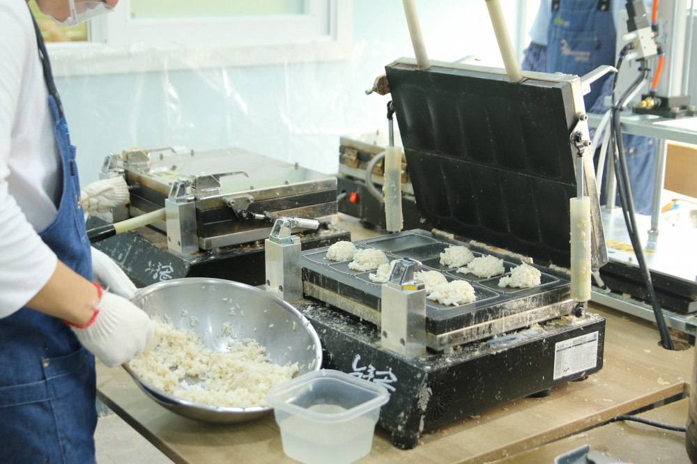 “더운데 물 드셔야 되는거 아니에요?” 물을 가지러 가던 창성 씨가 뒤돌아 다시 묻는다. “얼음물로 드릴까요?” 이내 얼음이 찰랑찰랑한 물 한 컵이 준비됐다. “물 많이 드시고 피부 더 좋아지세요.(웃음)” 지윤 씨는 창성 씨를 ‘작업반장’이라고 소개했다. 창성 씨는 직원 중에서도 단연 에이스다. 배송 업무를 마치고 돌아온 창성 씨는 붕어빵 기계와 비슷하게 생긴 누룽지 기계 앞에 서서 누룽지를 만들기 시작했다. 붕어빵 기계처럼 칸칸이 나눠진 기계에 밥주걱으로 현미밥을 나눠담은 후 뚜껑을 닫고 기다리면 된다. 시간이 다 되면 핸드폰 하나 정도 크기의 누룽지 과자가 완성된다. 뜨거운 기계를 다루는 일이라 숙달된 두 명의 직원만이 기계를 도맡아 누룽지를 만든다. 창성 씨는 그 두 명 중 한 명이었다.