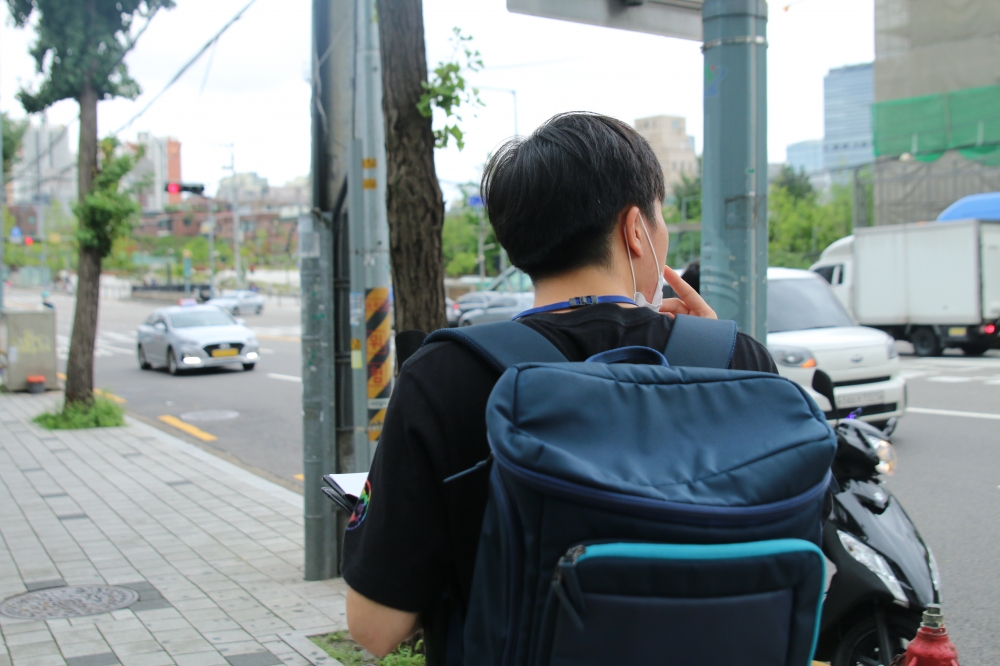 오랜만에 비가 오지 않는 낮이었다. “비가 오면 물건이 안 젖게 가방을 앞으로 메요.” 효창공원역에서 목적지까지 오르막길이 이어졌다. 땀이 비 오듯 흘렀지만 상호 씨는 걸음을 늦추지 않았다. 상호 씨는 배송 완료 후 거래명세서에 싸인을 받고, 보조단말기기를 통해 회사에 연락했다. 회사로 돌아가는 길은 왠지 더 짧게 느껴졌다. 지하철에서 잠시 떨어져 앉게 된 동안 상호 씨는 이어폰을 꺼내 노래를 들었다. 평소에는 노래를 들으며 이 시간을 보낸다고 했다. 역에 도착해서 상호 씨의 핸드폰을 보니 ‘슈가맨’에서 나온 장나라의 노래를 듣고 있었다.