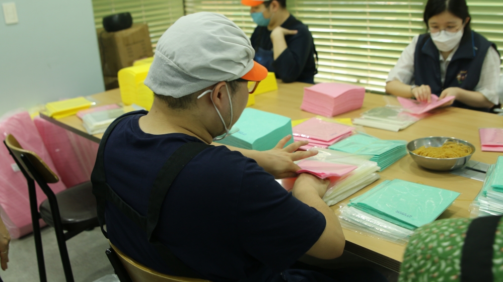 꿈더하기에서 발달장애 직원들이 한 업무의 끝엔 비장애 직원들의 손길이 닿아있다. 비닐로 포장된 행주를 열 개씩 세어 고무줄로 묶는 등 마무리 작업은 비장애 직원들의 몫이다. 꿈더하기에서 직원들은 각자 할 수 있는, 그리고 해야 하는 일을 한다. “외부에서 보면 이런 면이 적응이 안 될 수 있어요.” 지윤 씨는 덤덤하게 입을 열었다. “그렇지만 그게 그 친구에게 맞는 일인 거예요. 그 친구가 할 수 있는 일을 하는 거죠. 어떤 친구는 뚜껑을 닫는 게 편한 친구여서 그런 일을 도맡아 하고. 이건 직업이라는 걸 가질 수 있는 기회가 되죠.”