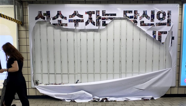 ▲지난 8월 2일 훼손된 신촌역 성소수자 차별 반대 광고 ⓒ연합뉴스
