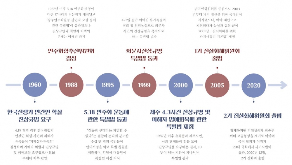 과거 청산은 피해자들이 스스로 왜 그런 일을 당했는지조차 모른다는 문제의식에서부터 시작된다. 피해자들이 진정으로 원하는 것은 대체 무엇 때문에 자신이 그런 일을 당해야 했고, 자신의 삶을 빼앗겼는지를 아는 것이다. 결국 진상규명은 과거 청산의 시작점이 될 수밖에 없다.