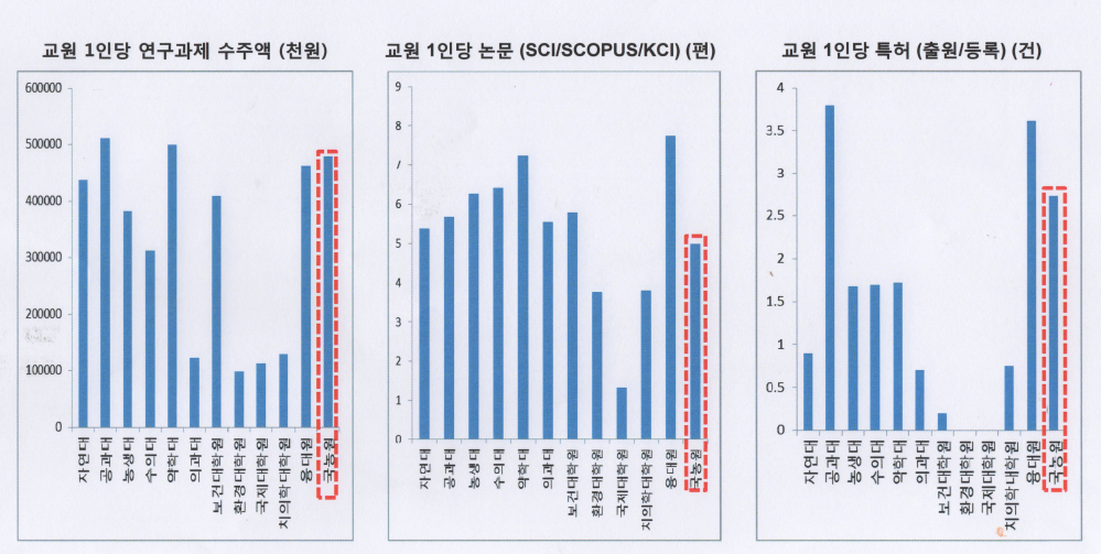 ▲국제농업기술대학원 강상기 교수가 ‘서울대학교 통계연보 2015년판’을 참고해 작성한 그래프. 이에 따르면 평창캠 교원들의 연구 성과는 서울대 내 다른 전문대학원과 비교해도 밀리지 않는 수준이다. Ⓒ강상기 교수