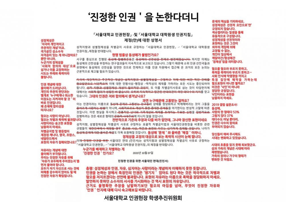인권헌장 제정 논의가 본격화되자 이번에도 대자보 전쟁이 벌어졌다. ‘진정한 인권을 위한 서울 대인 연대(진인서)’는 대자보를 통해 차별금지 규정이 ‘부도덕한 성행위에 대한 비판의 자유를 박탈한다’며 인권헌장 제정을 반대하는 성명을 발표했다. 진인서 김은구 대표는 “차별 금지 사유에 성적 지향과 성별 정체성을 포함하는 것은 젠더 이데올로기를 권력기관이 일방적으로 강제하는 것과 같다”며 “가치판단과 의사표현을 규제하고 이에 대한 불이익 처분을 정당화하는 것”이라고 주장했다.