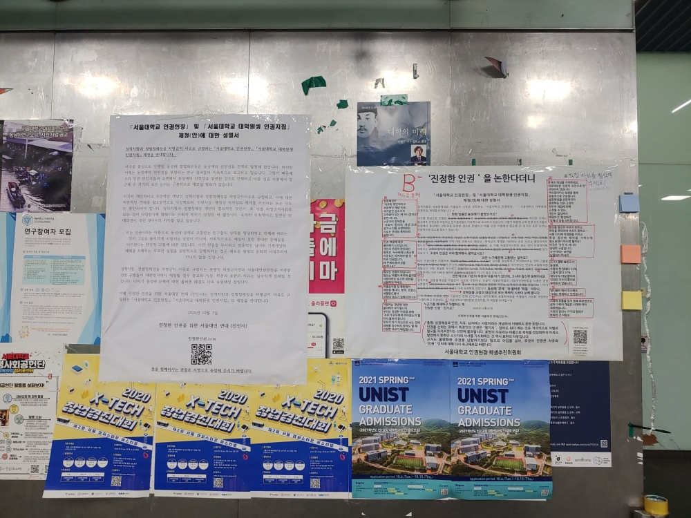 지난해 10월, 학내 게시판들이 대자보로 뒤덮였다. 「인권헌장」‧「대학원생 인권지침」 제정(안) 논의가 본격화되자 반대 측이 게시한 대자보들이었다. 이들은 ‘성적 지향 및 성별 정체성’ 을 차별 금지 사유로 규정한 인권헌장 제3조(차별금지와 평등권)에 반발했다. 온라인으로 개최된 ‘서울대학교 「인권헌장」‧「대학원생 인권지침」 제정(안)에 관한 공청회(공청회)’에서는 성소수자 들을 향한 혐오 댓글이 쏟아지기도 했다. 이에 맞서 인권헌장 제정을 지지하는 대자보들도 연이어 게시되며 이른바 ‘대자보 전쟁’이 벌어졌다. 인권헌장 제3조가 대체 어떤 내용을 담고 있길래 이토록 심한 반대가 잇따랐던 것일까.