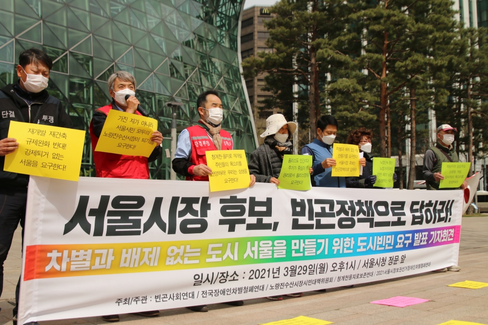 29일 서울시청 앞에서 빈곤사회연대·전국장애인차별철폐연대·노량진수산시장시민대책위원회·청계천을지로보존연대·2021서울시장보궐선거장애인차별철폐연대 등 5개의 단체는 ‘서울시장 후보, 빈곤 정책으로 답하라’는 기자회견을 열었다. 주최 측은 개발 공약만 내놓는 서울시장 후보들을 비판하며 제대로 된 빈곤 정책의 수립을 촉구했다.