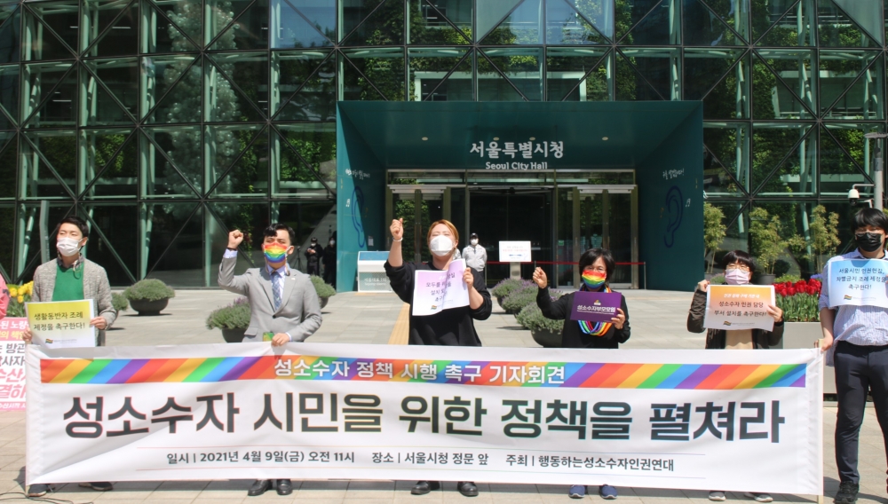9일 서울시청 앞에서 행동하는성소수자인권연대(행성인)의 주최로 성소수자 차별과 불평등의 개선을 요구하는 기자회견이 열렸다. 신임 서울시장의 선출을 맞아 열린 이날 기자회견에서 행성인은 오세훈 서울시장에게 성소수자 시민의 인권 보장을 위한 정책을 촉구했다.