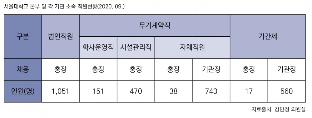 한편 예산요구서에 관한 <서울대저널>의 질의서에 본부는 “정부에 대한 예산요구는 학교가 임의로 결정하여 추진하고 배정받는 방식이 아니라 정부의 조직과 편제에 의해 정해지는 것”이라며 자체직원 인건비의 예산 반영은 어렵다고 답했다. 본부는 “자체직원은 기존 공무원인 법인직원과는 다르게 학교의 연구, 사업, 공개강좌 등 사업의 필요에 따라 해당 사업 수행을 위한 사업예산의 범위 내에서 채용되는 형태”라며 “당초 감안한 정원이 아닌 각 기관의 사업에 따라 스스로 채용한 자체직원을 모두 포함하여 예산을 배정하는 것은 현실적이지 않다”고 설명했다.