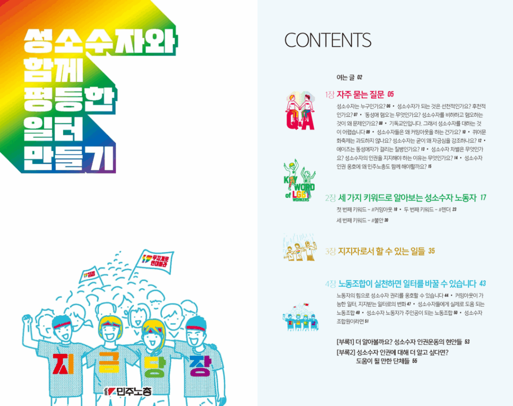 변화는 이미 시작됐다. 2015년 민주노총은 사무총국 처우규칙을 개정해 동성 배우자를 둔 사무총국·지역본부 사무처 활동가에게 가족수당을 지급하고 있다. 슈미 활동가는 “노동자분들을 만나 보면 ‘그나마 기댈 수 있는 언덕이 노동조합’이라고 말한다”며 “완전무결하진 못하더라도 노동조합은 변화를 논의할 수 있는 조직이기에 함께 활동하고 소통하고 있다”고 말했다.은 2016년 이후로 서울과 각 지역에서 열리는 퀴어문화축제에 공식 참여하고 있다.