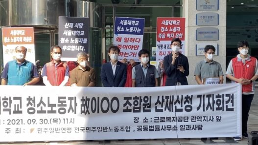 30일 오전, 지난 6월 사망한 관악사 청소노동자 이모 씨의 유족과 민주노총 민주일반연맹 전국민주일반노동조합(일반노조)이 근로복지공단에 산업재해를 신청했다. 이들은 고인의 죽음이 명백히 열악한 노동환경에서 비롯한 산업재해라고 주장하며 산재 신청 배경을 설명했다.