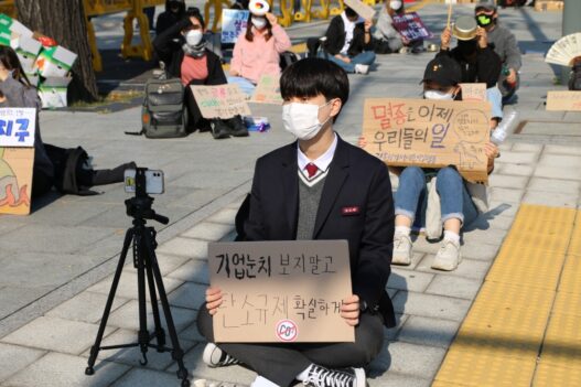 지난 22일, 청소년기후행동(청기행)은 정부서울청사 앞에서 기후파업을 진행했다. 이날 행사는 제26차 유엔기후변화협약 당사국 총회(COP26)을 앞두고 전 세계 청소년들이 공동으로 진행하는 동시다발 글로벌 기후파업의 일환으로 주최됐다. 기후파업에선 27일 국무회의 최종 의결을 앞둔 2030국가온실가스 감축목표(NDC)와 ‘2050 탄소중립 시나리오’가 기후위기를 대응하는 데 역부족이라는 비판이 나왔다.