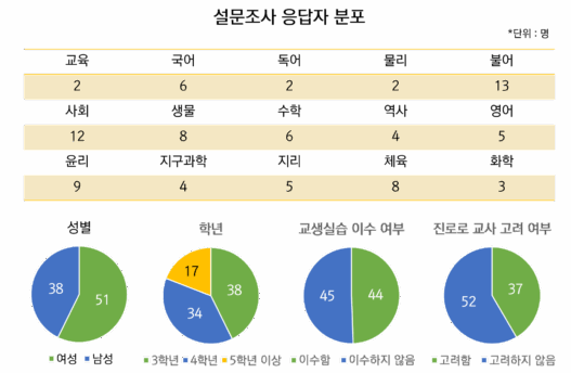 사범대학의 목적성에 대한 근본적인 숙고를 요구하는 학생들도 있었다. 한 응답자는 “사실상 교사 양성보다는 연구자 양성에 초점 맞추고 있는 것 같다”고 봤다. 또 다른 응답자는 “교원양성이라는 목적대학으로서의 기능과 연구 중점의 종합대학 기능 중 무엇에 중점이 있는지 명확하지 않아 교육과정도 모호하게 구성된 것 같다”고 지적했다.