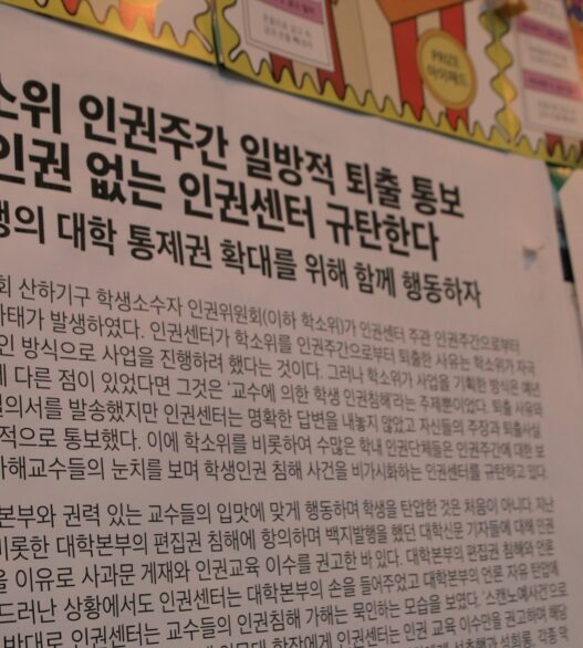 부 학내 노동환경에 있어서 부족한 점이 있고, 더 나은 대학 공동체를 위해 당연히 개선돼야 한다. 다만 학생회는 학생들의 이익을 우선적으로 대변해야 하는 단체다보니 기준을 두고 사안별로 접근하는 것이 필요하다. 총학생회칙 2조는 ‘본회는 사회 발전에 능동적으로 기여하고 학생들 간의 단결을 강화하며 대학의 자치를 완전히 실현함을 그 목적으로 한다’고 명시한다. 올해 연석회의에서는 해당 조항에 의거해 사안 대응 여부를 결정해왔다. 소수자에 대한 차별은 총학생회 산하기구인 학소위와 협의해 대응해나가겠다. 다만, 학소위에서 장애 인권은 상대적으로 덜 다뤄지고 있다고 판단해 총학생회 공약으로 준비했다.