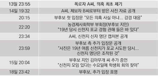 폭로자 A씨가 첫 게시글을 올린 것은 지난 13일 밤이다. A씨는 ‘익명의 제보자(B씨)로부터 부회장 후보 전현철 씨가 신천지 신자라는 소식을 듣게 됐다’, ‘신천지는 그동안 여러 반사회적인 행태들로 인해 많은 물의를 일으키고 있는 집단’이라며 전 후보에게 의혹 해명을 요구했다. A씨에 따르면 제보자 B씨는 탈퇴한 신천지 신자로, 학내 구성원이 아닌 외부인이다.