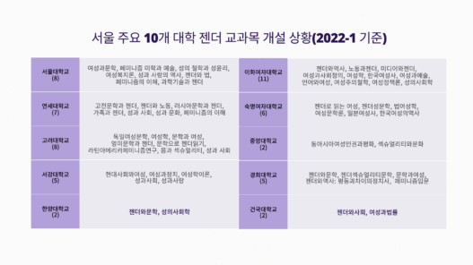 2022년 1학기에 서울대에 개설된 젠더 교과목은 ‘여성과 문학’, ‘페미니즘 미학과 예술’, ‘성과 사랑의 역사’, ‘젠더와 법’을 포함한 총 8개다. 매 학기 약 4천 개의 강의가 개설되는 것을 고려하면 대학 교육에서 젠더 교과목은 비중은 매우 적다. 다른 대학도 사정은 비슷하다. 2022년 1학기 기준 주요 10개 대학 중 10개 이상의 젠더 교과목이 개설된 곳은 단 한 곳뿐이다.