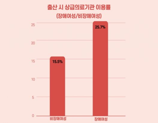 출산할 의료기관을 선택하는 것에도 제약이 따른다. 장애여성은 고위험산모로 분류되기 때문에 가까운 동네 산부인과가 아닌 종합병원 등의 상급의료기관을 이용해야 하기 때문이다. 실제로 보 건복지부에 따르면 2018년 비장애여성의 상급의료기관 이용 비율은 15.5% 인데 반해, 장애여성의 이용 비율은 25.7%에 달했다. 그렇다보니 상급의료기관이 없는 소도시에 거주하는 장애여성들은 산부인과 검진을 받을 때마다 장시간 이동을 감수해야 한다.