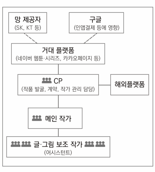 웹툰‧웹소설 창작자들도 어려움을 겪고 있다. 중층 하도급 구조, MG 계약, 프로모션의 세 기둥은 웹툰·웹소설 플랫폼이 구축한 불평등 구조를 공고히 지탱한다. 웹툰·웹소설 산업은 카카오페이지, 네이버 웹툰, 리디로 대표되는 거대플랫폼 바로 아래에 CP가 있고, 그 아래 메인 작가가 존재하는 수직구조를 지닌다. CP는 작품의 발굴, 계약, 작가 관리를 맡고 플랫폼과 직접 소통한다. 메인 작가는 작품을 총괄하는 창작자이고, 메인 작가 아래에는 또 수많은 보조 작가, 일명 어시스턴트가 존재한다. 끝없이 이어지는 수직구조 속에서 작품이 창작되는 것이다.