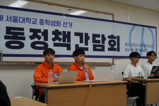 11월 5일 오후 4시, 사범대학 10-1동 308호 강의실에서 제63대 총학생회 선거 공동정책간담회가 열렸다. 선거관리위원회에서 개최한 이번 공동정책간담회는 선거에 출마한 ‘정오’, ‘공명’ 선거운동본부(선본)의 후보들이 공약에 대한 질문에 답하는 자리였다. 현장에는 학내 언론, 선거참여패널 등을 포함해 20여 명의 인원이 참석했으며, 공동정책간담회는 총학생회와 SUB를 통해 온라인으로도 생중계됐다. 공동정책간담회는 후보 측 모두 발언, 사전 질의에 대한 응답, 추가 질의응답, 방청객과 온라인 개인 질의에 대한 응답 순서로 진행됐다.
