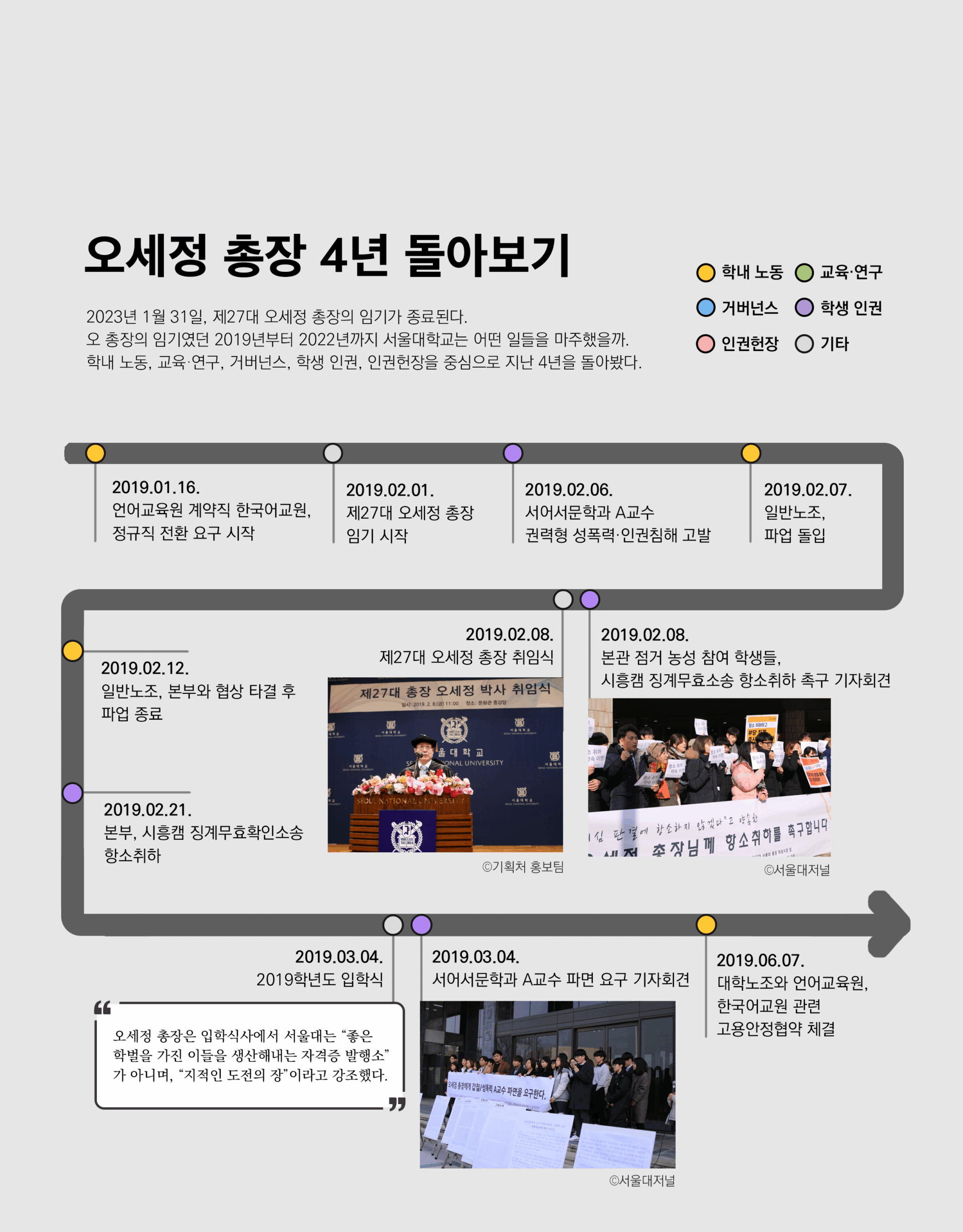 2023년 1월 31일, 제27대 오세정 총장의 임기가 종료된다. 오 총장의 임기였던 2019년부터 2022년까지 서울대학교는 어떤 일들을 마주했을까. 학내 노동, 교육·연구, 거버넌스, 학생 인권, 인권헌장을 중심으로 지난 4년을 돌아봤다.