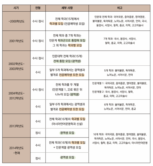 이렇게 복잡한 인문대학 신입생 모집제도는 2000년대 학부제의 도입과 함께 수차례 바뀌어 왔다. 2000학년도까지 인문대학은 모든 학과, 모든 전형에서 전공예약생 모집 제도를 유지했다. 변화가 시작된 것은 2001년도부터다. 2001학년도 학부제를 도입한 인문대학은 수시 고등학교장 추천입학전형과 정시전형에서 7개 학과(국사, 동양사, 서양사, 철학, 종교, 미학, 고고미술사)를 인문계 학과군으로 통합해 인문광역생 모집을 시작했다.