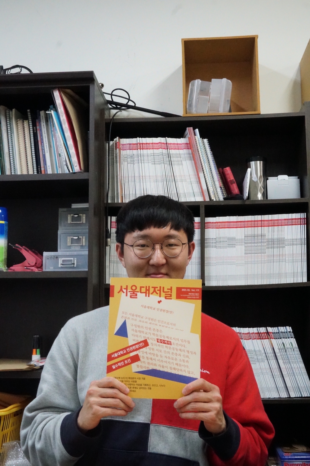 저 널 177호 커버스토리 ‘필수적인 조건’에 대한 평가를 부탁드린다.강다겸 인권헌장에 대해 학내에서 충분한 합의가 이루어졌고 이제는 제정만 하면 된다는 메시지를 단호하고 일관적으로 전하고 있다고 느꼈다. 저널을 통해 그런 말을 접한 것이 힘이 됐던 것 같다. 한편으로는 일관성이 기사 세 편을 단조롭게 만들었단 느낌도 받았다. 인권헌장에 대해 다뤘다고 했을 때 인권헌장 제정을 방해하는 움직임과 최근에 입학한 학생들의 경향성 등에 대한 내용도 수록되길 기대했는데 많이 다뤄지지는 않아 아쉬웠다. 도수안 인권헌장 전문에 있는 ‘필수적인 조건’이라는 표현에 집중한 제목이 인상적이었다. 인권을 존중하는 것이 왜 필수적인 일인지 커버스토리 전반에서 설명을 잘 한 것 같다. 지금까지의 인권규범 논의 흐름을 정리하고, 제정되지 않고 있는 이유를 다루고, 앞으로의 미래를 다루는 세 편의 기사 흐름이 좋았다. 특히 ‘인권헌장, 얼마나 알고 있니?’에서 인권헌장(안) 중 네 가지 조항을 자세하게 설명한 부분이 인권헌장에 대한 상세한 이해에 도움이 많이 됐다.양재표 기사를 읽음으로써 인권헌장이 무엇인지, 왜 필요한지 알 수 있어서 좋았다. 하지만 저널만의 신선한 접근이 조금 덜 드러났던 것이 아쉬웠다. 커버스토리 후반으로 갈수록 인권헌장 제정을 평소에도 강조해왔던 단위들, 연구 참여자들이 항상 했던 이야기와 논의가 반복되는 느낌이 있었다. 표지도 아쉬운 점이 있었는데, 이태원 참사에 관련한 내용이 직관적으로 드러났던 176호와 달리 텍스트가 많아서 멀리서 봤을 때 어떤 이야기를 하는 제호인지 감이 잘 잡히지 않았다.여동준 새로 취임한 유홍림 총장이 인권헌장에 관련해 어떤 행보를 보일지에 대한 내용이 나오지 않은 점이 조금 아쉬웠다. 더불어 ‘인권헌장, 얼마나 알고 있니?’에서 특별히 꼽아서 설명한 인권헌장(안)의 4개 조항을 어떤 기준으로 선정한 것인지 조금 더 자세하게 서술했으면 좋았을 것 같다. 인권규범에 관한 다른 학교의 사례도 포함됐으면 좋았을 것 같고.저 널 기억에 남는 기사가 있다면? 그 이유는 무엇인가?강다겸 가장 좋았던 기사를 하나만 꼽자면 ‘오감을 유지하자’ 코너의 ‘어떤 총소리는 사라질 수 없다’였다. 4월은 고통과 재현에 대해 많이 생각해 보게 되는 달이다. 그 주제를 다루는 연극 ‘빵야’를 통해 국가폭력과 역사에서 누락된 존재들, 재현 윤리들을 깊게 생각하며 읽을 수 있었다. 문화부 기사들이 ‘문화’에 대해 상상할 수 있는 일반적인 영역에 갇히지 않고 다양한 관점들을 다룬 것이 좋았다. ‘사진으로 보다’ 코너는 사진을 쓰는 의미가 있어야 한다는 말을 많이 했는데, 이번 ‘사진으로 보다’에서 그것이 잘 이루어진 것 같다. 배리어프리를 적용한 예술 현장의 사진 등이 주는 강렬함이 좋았다.도수안 ‘크레딧이 오른 후에도 남아 있는 것들’이었다. 앞서 실린 ‘캠퍼스라이프’ 코너, ‘사진으로 보다’ 코너 등 문화에 대한 기사들을 읽다가 예술 창작 과정에 대해 성찰할 수 있는 기사가 나오니까 흐름상으로도 좋은 충격을 받았다. 환경에 관련된 내용이지만 문화부에서 다룬 것도 좋다고 생각했다. 환경은 어느 분야에서도 뗄 수 없는 문제니까. ‘사진으로 보다’ 코너의 ‘선을 지우는 사람들’도 좋았다. 글로만 보면 이해가 잘 되지 않는 문화 예술 분야의 배리어프리 확보 노력들을 사진을 보고 바로 이해할 수 있어서 좋았다.양재표 기고 ‘임을 위한 행진곡을 위한 장송곡’이 내용도, 사진도 좋았다. 성폭력 가해자 H교수 파면을 외치며 성사된 2018년 사회대 학생총회 사진을 보고 ‘이런 사건도 있었고, 학생회가 적극적으로 활동하는 시절도 있었구나’ 싶었다. 두 번째로는 ‘버티거나, 포기하거나’가 좋았다. 수유에 관해서는 생각을 별로 해보지 않았는데 기사를 통해 새로운 문제의식도 얻었고, 수유하는 여성들이 겪는 불편함에 공감도 됐다. 수유할 권리 보장과 공공장소 수유시설 설치 등은 현실에서 입법을 통해 상대적으로 쉽게 해결할 수 있을 테니, 기사를 통해 인식한 문제에 답답한 마음보단 개선을 바라는 마음이 들었다. 중요하지만 잘 몰랐고, 실제 해결도 가능해 보이는 문제를 논리적으로 짚어주신 점이 인상 깊었다.여동준 우선 ‘크레딧이 오른 후에도 남아있는 것들’ 기사가 한 번도 고민해보지 않았던 측면을 짚어줘서 좋았다. 소품을 공동으로 관리하는 것만으로도 영화 산업의 환경문제를 개선할 수 있을 것이라는 발상의 전환을 이끌어주는 점에서 좋은 기사였다. ‘벗어나고 싶은 기억으로부터’도 좋았다. 기사에 언급된 학대 피해 아동의 진술 과정이나, 아동의 진술은 잘 인정되지 않는다는 내용을 보고 아동이 진술을 어떻게 해야 객관성과 신빙성을 얻을 수 있을지 추가적인 궁금증이 들기도 했다. 독자의 질문을 이끌어낼 수 있는 좋은 기사였다. 마지막으로 ‘버티거나, 포기하거나’도 흥미로운 기사였는데, 학부생의 경우 사례가 적겠지만 대학원생의 경우 얼마든지 겪을 수 있는 문제 같아서, 학내 수유 시설이 충분히 마련돼 있는지 서울대의 상황에 대한 