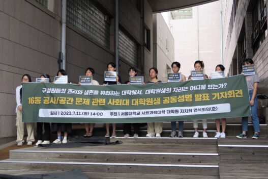 7월 11일 오후 2시, 사회대 대학원생들이 사회과학대학 16동 앞에서 기자회견을 열고 사회과학대 대학원생 152명의 공동성명을 발표했다. 이들은 7월 말 시작되는 사회대 16동 신축공사를 앞두고 구성원의 안전 보장과 학업·연구권 침해 최소화를 위한 대책이 마련돼 있지 않다며 대책 마련을 촉구했다. 사회과학대학은 7월 말부터 16동 리모델링 및 한국경제혁신센터 신축 공사를 진행할 예정이다. 예상 공사 기간은 이번 여름부터 2027년까지다.