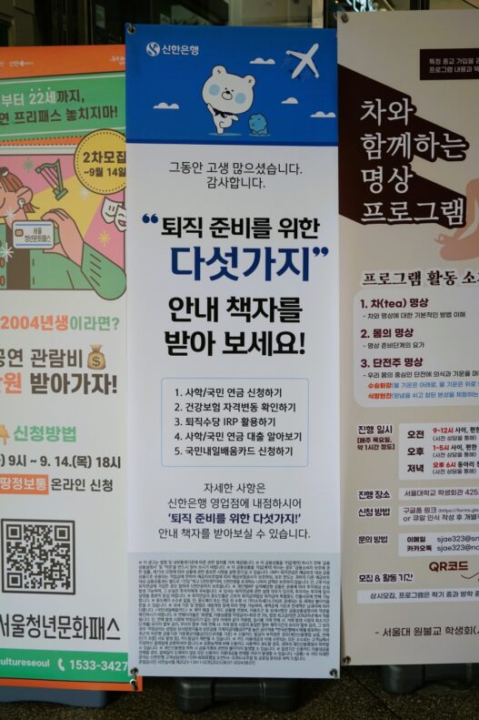 사진 설명 시작. 신한은행에서 제공하는 퇴직자를 위한 배너다. 맨 위쪽에는 파란색 배경 위에 신한은행의 곰돌이 마스코트와 함께 비행기 그림이 그려져 있고, 그 바로 아래에는