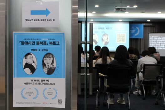 지난 10월 10일 〈서울대저널〉이 변재원 작가와 『장애시민 불복종』 북토크를 개최했다. 서울대학교 153동 우정원 글로벌 사회공헌센터 210호에서 진행된 이번 북토크는 유튜버 구르 님(김지우 씨, 사회 20)이 대담자로 함께해 장애 운동, 대학과 장애, 계속하는 힘을 주제로 이야기를 나누고 질문을 주고받았다.