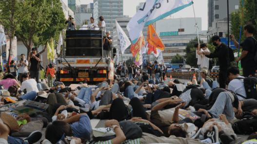 정부가 기후위기 문제를 도외시하고 책임을 회피하는 상황, 지난 9월 23일 서울 세종대로에서 정부의 적극적이고 현실적인 기후위기 대응책 마련을 촉 구하는 ‘923 기후정의행진’이 열렸다. 행진에 참여한 시민들은 ‘이대로라면 우리도 모두 멸종하여 사라질 수 있다’는 점을 시사하는 동시에 ‘기후위기를 가속화하는 체제를 멈추겠다’는 의지를 담아 사이렌 소리에 맞춰 죽은 듯 도로에 누워 항의하는 ‘Die-in(다이인)’ 퍼포먼스를 진행했다. 주최 측 추산 3만 명의 시민들은 용산 대통령 집무실과 광화문 정부서울청사로 행진하며 정부 에 ▲기후재난으로부터 안전하게 살아갈 권리 ▲노동자 일자리 보장하는 공 공재생에너지로의 정의로운 전환 ▲공공교통 확충을 통한 모두의 이동권 보장 ▲신공항건설 및 국립공원 개발사업 중단 ▲오염자 문책 및 기후위기 최일선 당사자 발언 경청의 다섯 가지를 요구했다.