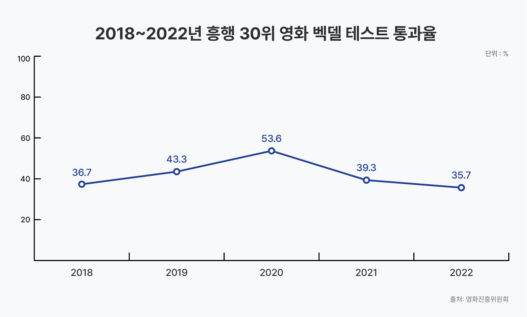 이름을 가진 여성이 두 명 이상 나올 것, 이들이 서로 대화할 것, 대화의 주제는 남성과 관련되지 않을 것. 영화의 성평등 수준을 측정하기 위해 주로 사용되는 ‘벡델 테스트’의 기준 세 가지다. 그리 까다로운 기준은 아니기에 많은 영화들이 벡델 테스트를 통과할 수 있을 것처럼 보이지만, 실상은 그렇지 않다. 대부분의 상업 영화는 여성 인물을 남성 인물 옆의 부수적인 존재로만 등장시키고 있기 때문이다. 영화진흥위원회(영진위)가 발간한 「2022년 한국영화산업 성인지 결산」에 따르면 2022년 흥행 순위 30위까지의 한국 영화 중 벡델 테스트를 통과한 작품은 단 10편이었다. 흥행 30위 영화 벡델 테스트 통과율은 2018년부터 2020년까지 상승하다가 2021년에 크게 하락한 후 2년 연속 하락세를 보이고 있다. 영진위는 이 같은 하락세의 원인으로 흥행 30위 내 한국 영화에 여성 감독과 여성 주연의 작품 수가 크게 줄어든 사실을 짚었다.