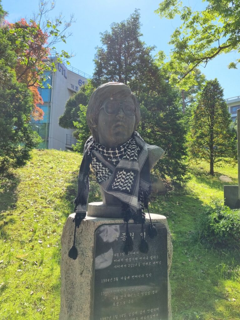 이날 수박은 인문대학 근처의 박종철 열사 흉상에 팔레스타인의 전통 스카프인 케피예를 두르기도 했다. 수박 이시헌 집행부원(자유전공 15)은 “박종철 열사는 잔인한 군부 정권에 맞선 저항의 상징”이라며, “자유와 해방을 위해 투쟁했던 선배 대학생들의 전통을 이어 나가겠다는 의미”라고 설명했다.