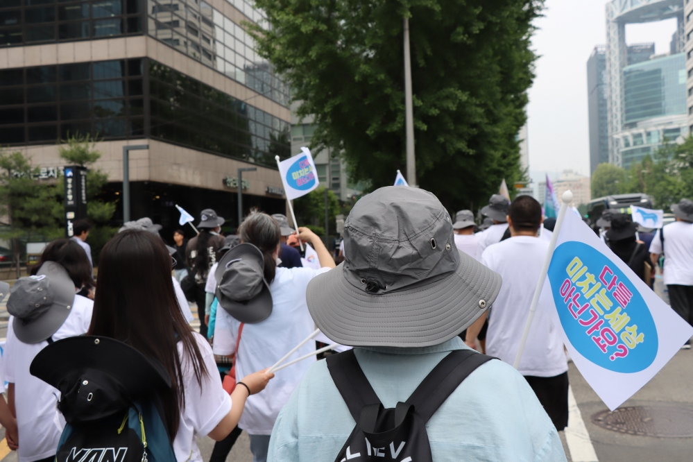 ▲행사명이 적힌 깃발을 들고 행진하는 참가자들
