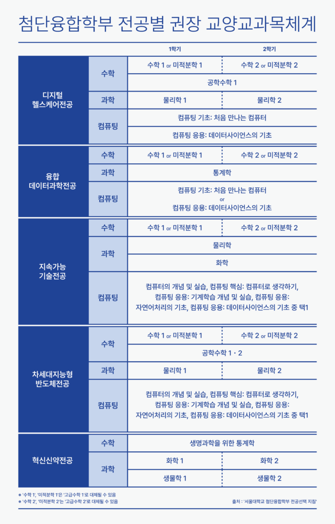 본부는 첨단융합학부를 설립한 이유로 ‘첨단 미래 산업을 이끌어갈 차세대 리더 양성을 위한 융합 교육’의 필요성을 제시한다. 4차산업혁명과 디지털 대전환 시대가 도래함에 따라, 과학기술 전문성과 초학제적 융합 소양, 그리고 소통·협업 능력을 갖춘 인재가 필요해졌다는 것이다. 첨단융합학부 이연 교무부학부장은 “서울대의 기존 단과대학은 각 분야에 대해 국내 최고의 교육 역량을 가지고 있다”며 “각 단과대학의 전문가들이 함께 교육 역량을 결집시켜 혁신적인 학습공동체를 만들기 위해 기존 단과대학의 증원이 아닌 새로운 학부의 신설을 추진했다”고 밝혔다. 첨단융합학부의 전공 또한 첨단 산업 수요가 많으며 융합 인재가 필요하다고 평가받는 ▲디지털헬스케어 ▲융합데이터과학 ▲지속가능기술 ▲차세대지능형반도체 ▲혁신신약 다섯 가지로 구성됐다.