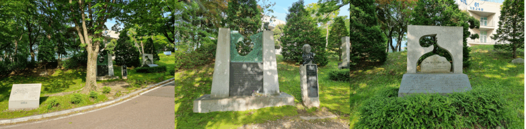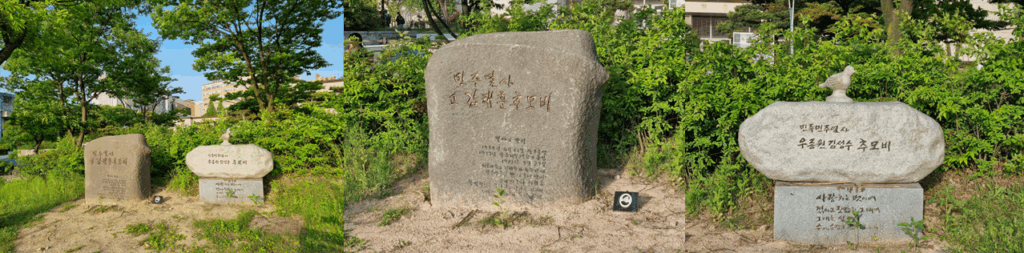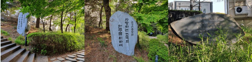 ▲농업생명과학대학 식당 근처 추모비(좌), 김상진 열사 추모비(중), 이동수 열사 추모비(우)