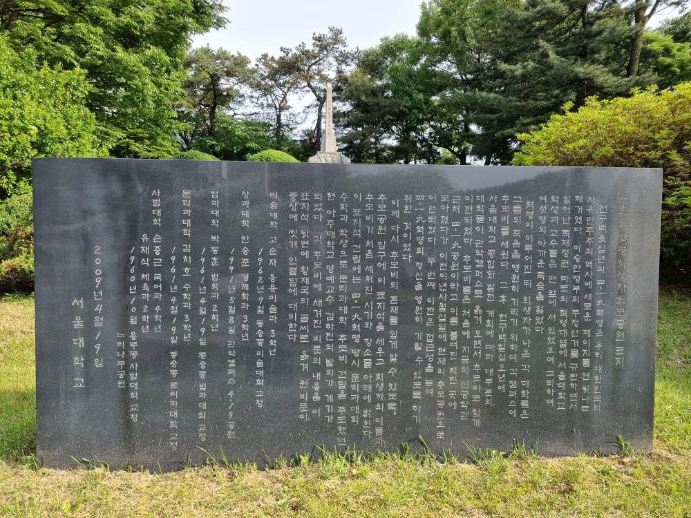 표지석을 지나쳐 올라가면 나오는 넓은 공간에는 추모비와 기념비, 동상과 기념탑이 있다. 민주화의 길 추진위원회 위원장으로 활동한 조흥식 명예교수(사회복지학과)는 일전 〈서울대저널〉과의 인터뷰에서 ‘4·19 혁명이 민주화의 물꼬를 텄고, 그것이 6월 민주항쟁으로 열매를 맺었다’고 말했다. 민주화의 길의 시작점이 4.19 기념 공원으로 선정된 것은 4·19 혁명이 민주화의 시발점이 됐기 때문이다.