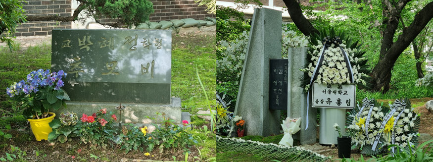 ▲박혜정 열사 추모비(좌), 화환이 놓인 김세진·이재호 열사 추모비(우)