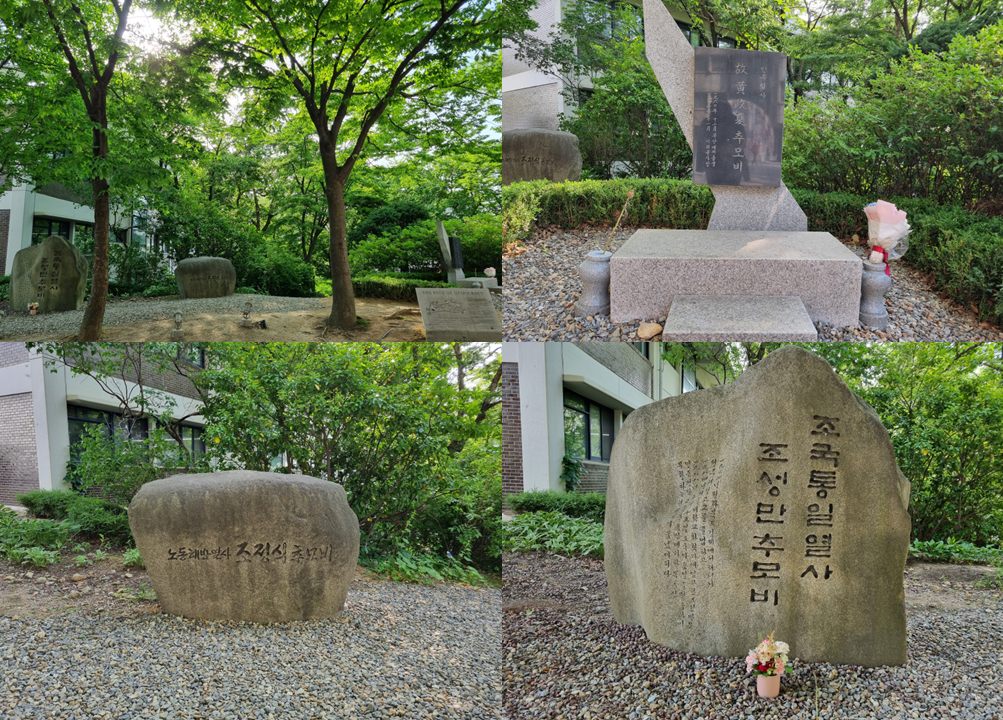 ▲자연과학대학 입구에 놓인 추모비(왼쪽 위), 황정하 열사 추모비(오른쪽 위) 조정식 열사 추모비(왼쪽 아래), 조성만 열사 추모비(오른쪽 아래)