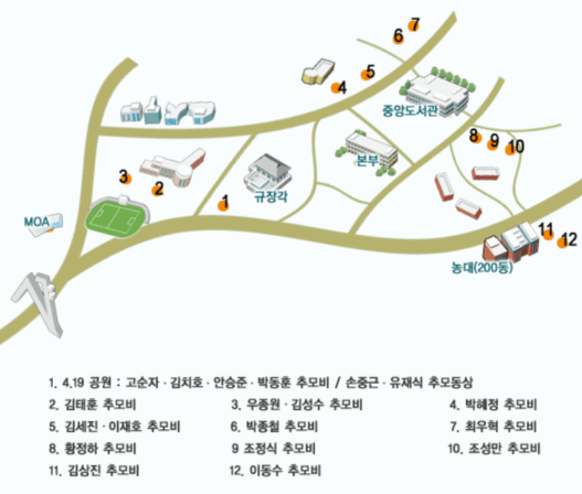 자연과학대학을 빠져나가 도착한 마지막 장소, 농업생명과학대학의 식당으로 내려가는 계단 중턱에서 오래 기다렸을 두 열사가 방문객을 맞이한다. 김상진 열사(축산 68), 이동수 열사(원예 83)다. 각각 1975년 4월 박정희 정권의 유신 체제에, 1986년 5월 전두환 정권의 유신 체제에 저항한 두 열사는 10년 가까이 되는 시간 차이에도 불구하고 같은 종류의 폭력에 저항했다. 민주주의를 되찾고 난 뒤 새로운 적이 등장해 다시 탈취당하고, 그 적에 대항해 다시 민주주의를 구해내는 순환이 30년 가까이 이어지는 동안, 학생들은 선대를 이어 다시금 목소리를 냈다. 이 목소리가 지금은 조형물의 형태로 캠퍼스에 남아 있다.